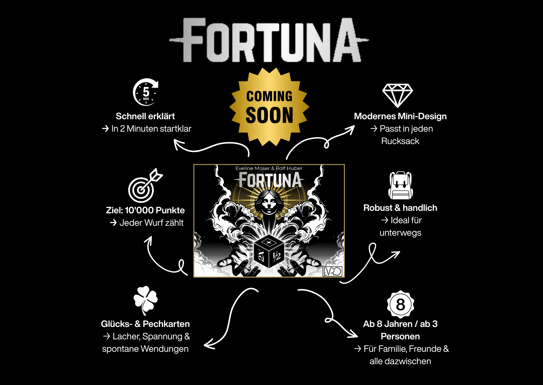 Klein, kompakt und randvoll mit Spannung: Mit FORTUNA holt ihr euch ein Spiel auf den Tisch, das überall Platz findet – aber im Kopf bleibt. Aus einfachen Entscheidungen entstehen überraschend taktische Duelle, bei denen Glück, Timing und clevere Züge darüber entscheiden, wer das Schicksal auf seiner Seite hat. Von den ersten Skizzen bis zur erfolgreichen Crowdfunding-Kampagne hat dieses Spiel eine Reise hinter sich, die mindestens so aufregend ist wie eine Partie selbst.