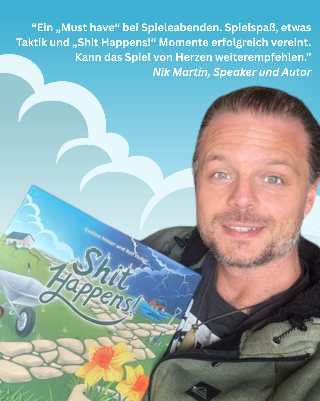 Nick sammelt Shit-Happens-Momente auf Reisen und erzählt sie herrlich unterhaltsam in seiner Show "Die geilste Lücke im Lebenslauf" – klar, dass das Spiel perfekt zu ihm passt. Geschenk gegeben, tolle Rezension bekommen: “Ein „Must have“ bei Spieleabenden. Spielspass, etwas Taktik und „Shit Happens!“ Momente erfolgreich vereint. Kann das Spiel von Herzen weiterempfehlen.”