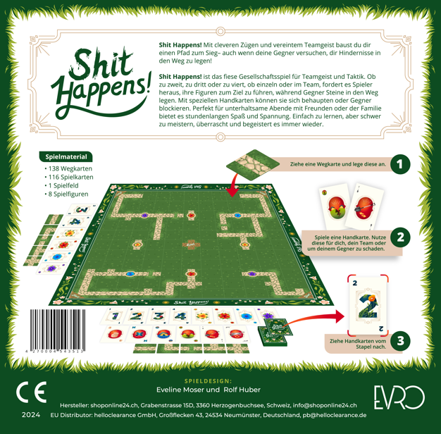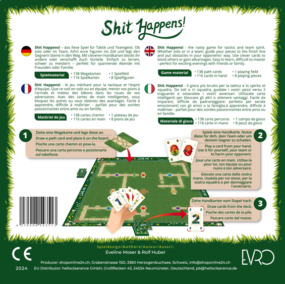 Fordere Familie und Freunde heraus und stürze dich in ein Brettspiel voller Spannung, Strategie und fieser Überraschungen! Shit Happens! liefert in jeder Runde neue Herausforderungen: Sabotiere deine Gegner, nutze clevere Taktiken und wende das Blatt im letzten Moment. Bist du smart genug, dich durch das Chaos zu kämpfen und als Erster das Ziel zu erreichen?