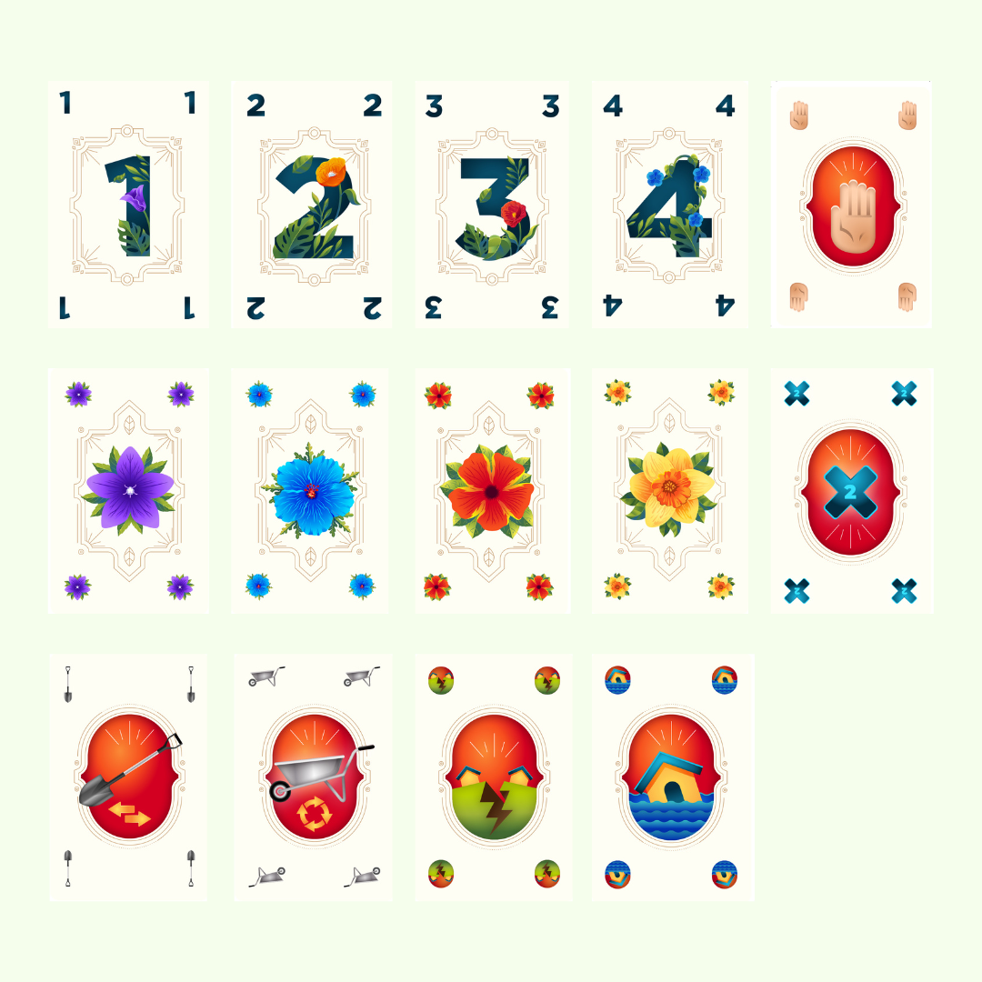 Mit Zahlen-, Blumen- und Spezialkarten wie „Erdbeben“ oder „Überschwemmung“ verändert ihr das Spiel, werft Gegner zurück und sichert euch Vorteile. Die Aktionskarten sorgen für Dynamik und Überraschungen!